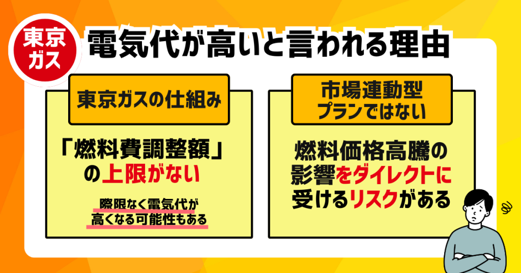 東京ガスの電気において重要な点は、電気料金に「燃料費調整額」の上限がなく、燃料価格が高騰すると他社より割高になるリスクがあることです。