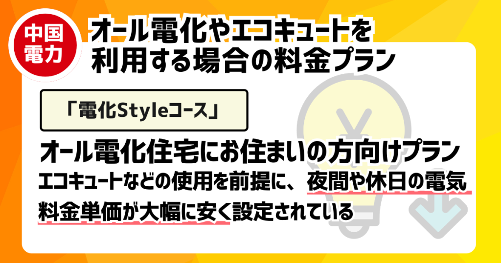 中国電力の「電化Styleコース」は、オール電化住宅にお住まいの方向けの標準的なプランです。