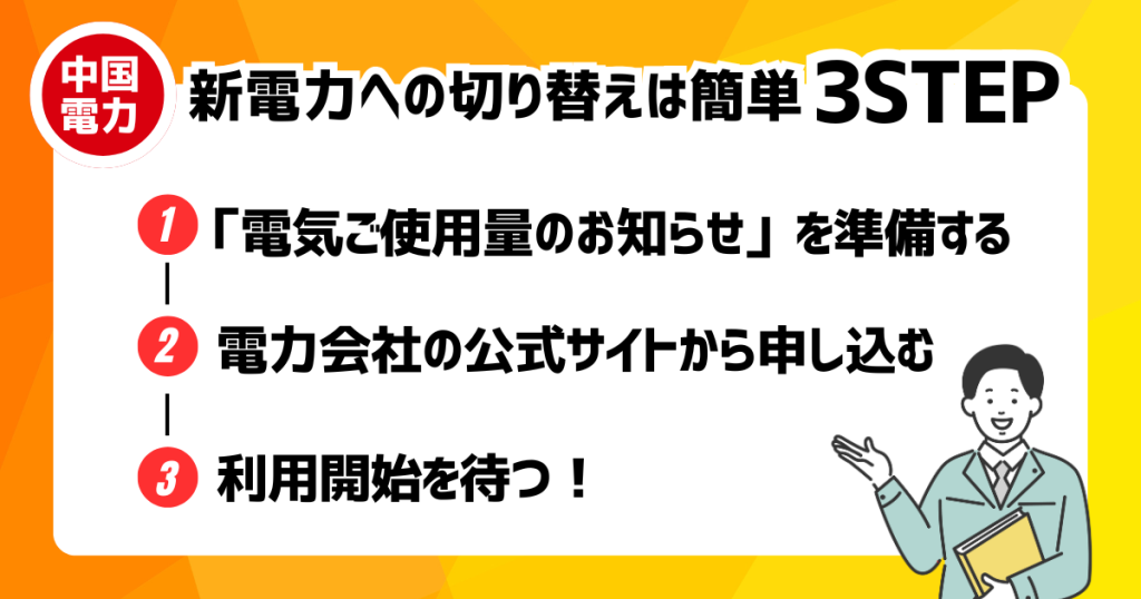 中国電力のプラン変更・新電力への切り替え手続きは簡単3ステップ