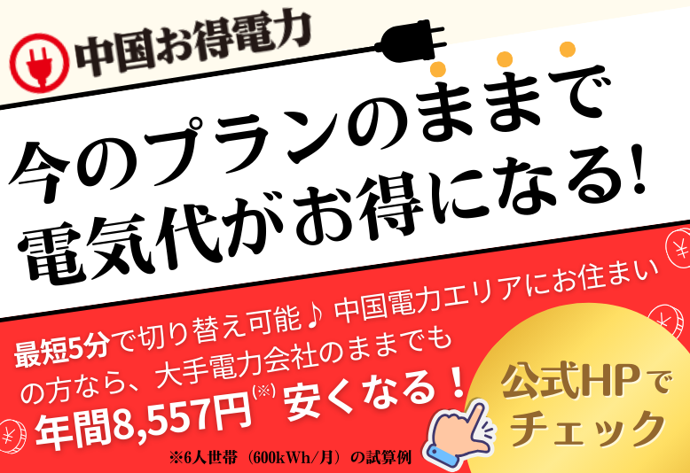 「中国お得電力」のサービスは、中国電力が提供するほぼすべてのプランに対応しており、現在契約中のプランと同等のサービス内容のまま切り替えが可能です。