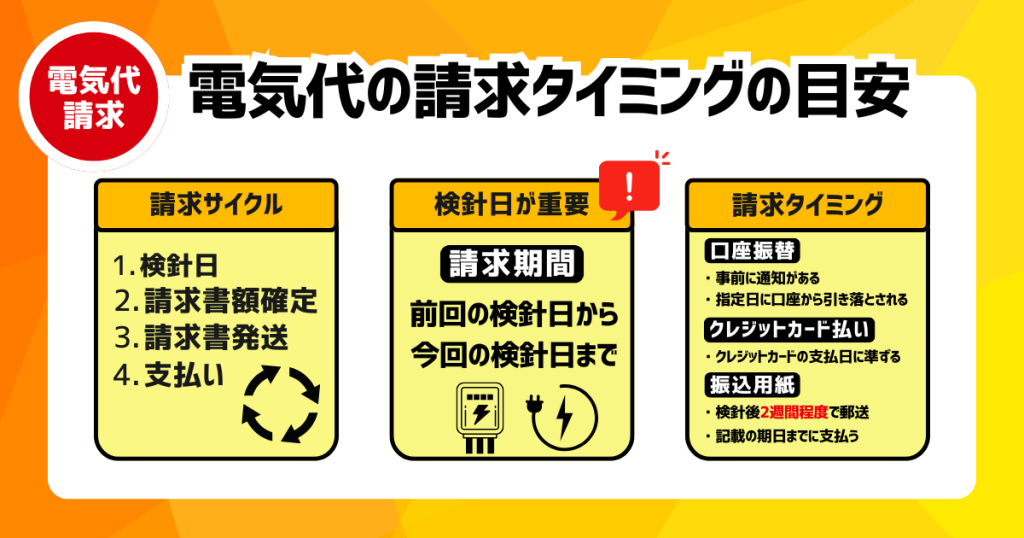 電気代の請求タイミングは、検針日を起点として、支払い方法や契約先の電力会社によって異なります。