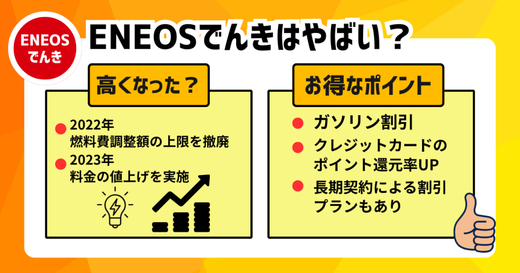 ENEOSでんきは過去に料金の値上げがあり、注意が必要です。ただしすべての状況で「やばい」わけではなく、利用するメリットもあります。