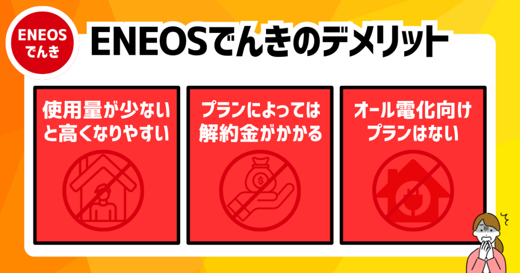 ENEOSでんきには、契約する前に知っておきたいデメリットや注意点がいくつかあります。「やばい」という評判が気になる方は、次の点を確認しておきましょう。