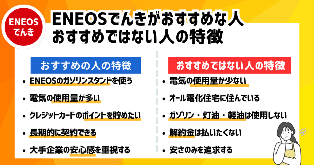 ENEOSのガソリンスタンドをよく利用する方や電気の使用量が多い家庭、特定のポイントを貯めたい方は、ガソリン代割引やポイント還元、長期契約割引などのメリットを活かすことで、お得に利用できる可能性があります。