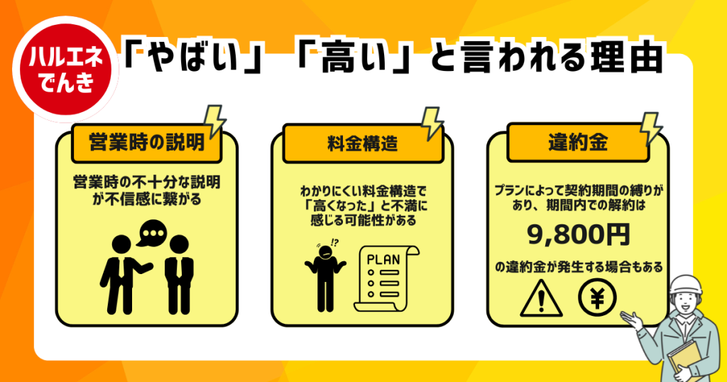 ハルエネでんきに対して「やばい」「高い」という評判が集まる背景には、主に3つの明確な理由があります。