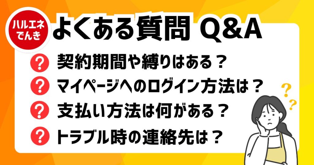 ハルエネでんきについて、契約前や利用中に疑問に思うことやトラブルが発生した際の対応など、気になる点は多いでしょう。