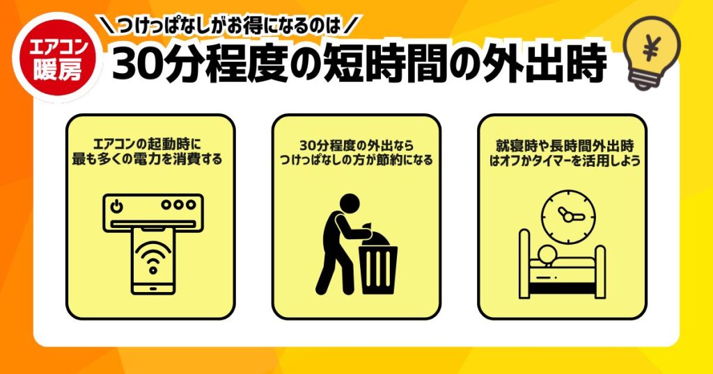 30分以内の外出、たとえば近所のコンビニやゴミ出し程度であれば、電源をオフにせず、つけっぱなしの方が節約につながるでしょう。
