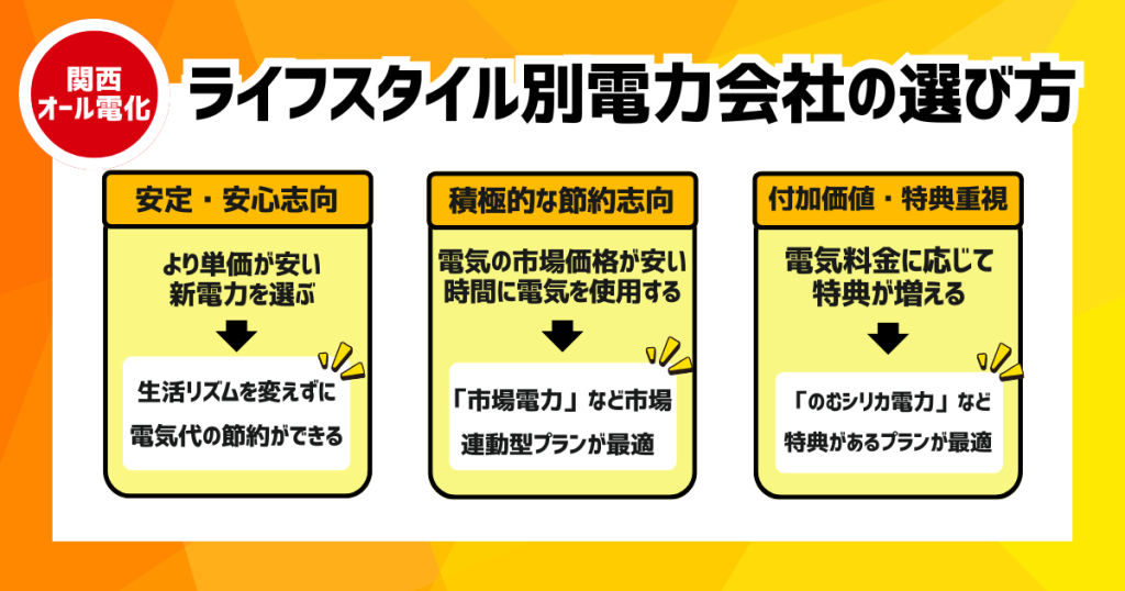 ここからは、それぞれのライフスタイルにあった電力会社の選び方を具体的に解説します。
