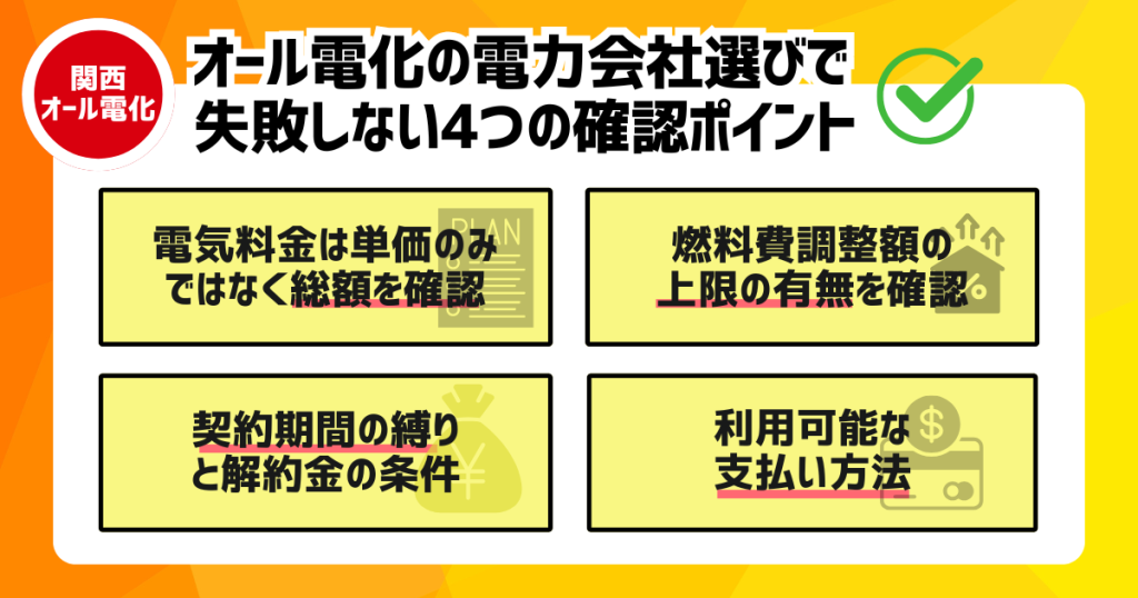 電力会社を切り替える際には、次の4つのポイントを確認しましょう。