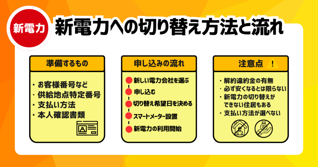 現在の電力会社から、新電力会社へ切り替える際の流れについて、次の3つの項目に分けて紹介します。