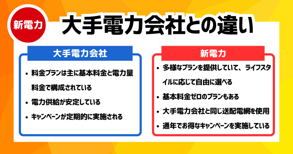 大手電力会社は発電から送電、販売までを一貫しておこなっているのに対し、新電力は電気を他社から調達し、販売に特化している点が特徴です。