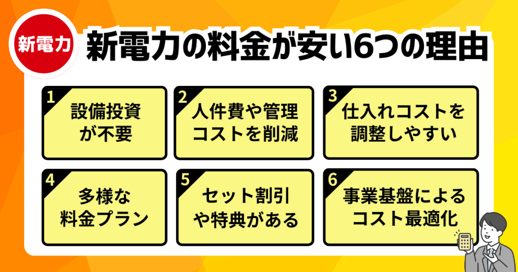 インフラの整備にかかる初期費用や維持費がかからない分、料金に還元しやすい点が新電力の大きな強みです。